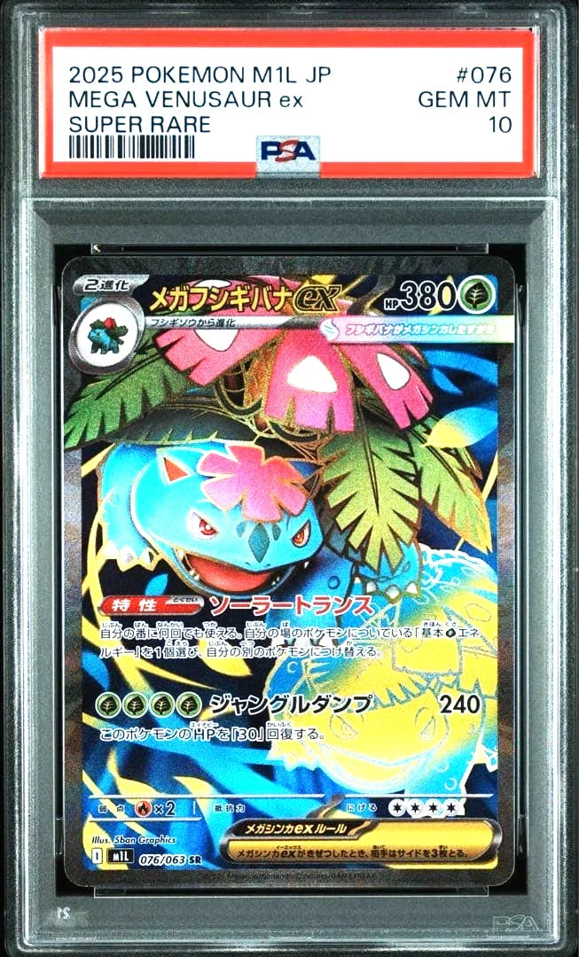 Mega Venusaur EX (076/075) from the Mega Brave expansion is a stunning card from the Mega Evolution Era of the Japanese Pokémon TCG. Graded PSA 10 Gem Mint, this card boasts flawless centering, pristine edges, and vibrant holographic detailing — representing the peak of quality for collectors of the Mega Evolution series.
